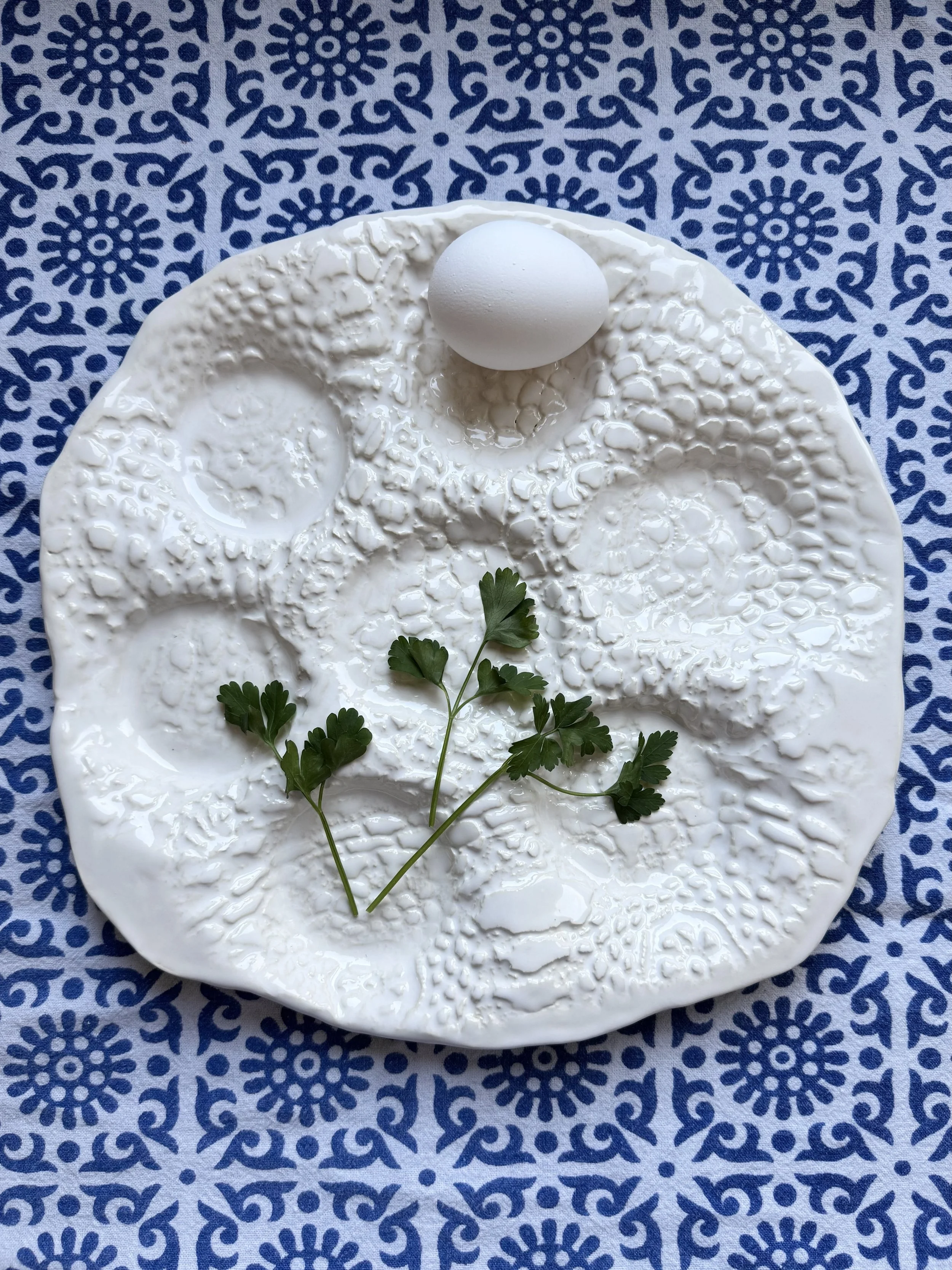 These sedar plates are created as a symbol of not only Passover but of the female role in Judaism. They are created with impressions made from beloved lace objects to create texture and shaped to accentuate movement with a node to nature through their organic form. The lace was inspired by the textured table clothes used by the generations before me that can be carried through to the generations to come by this plate.